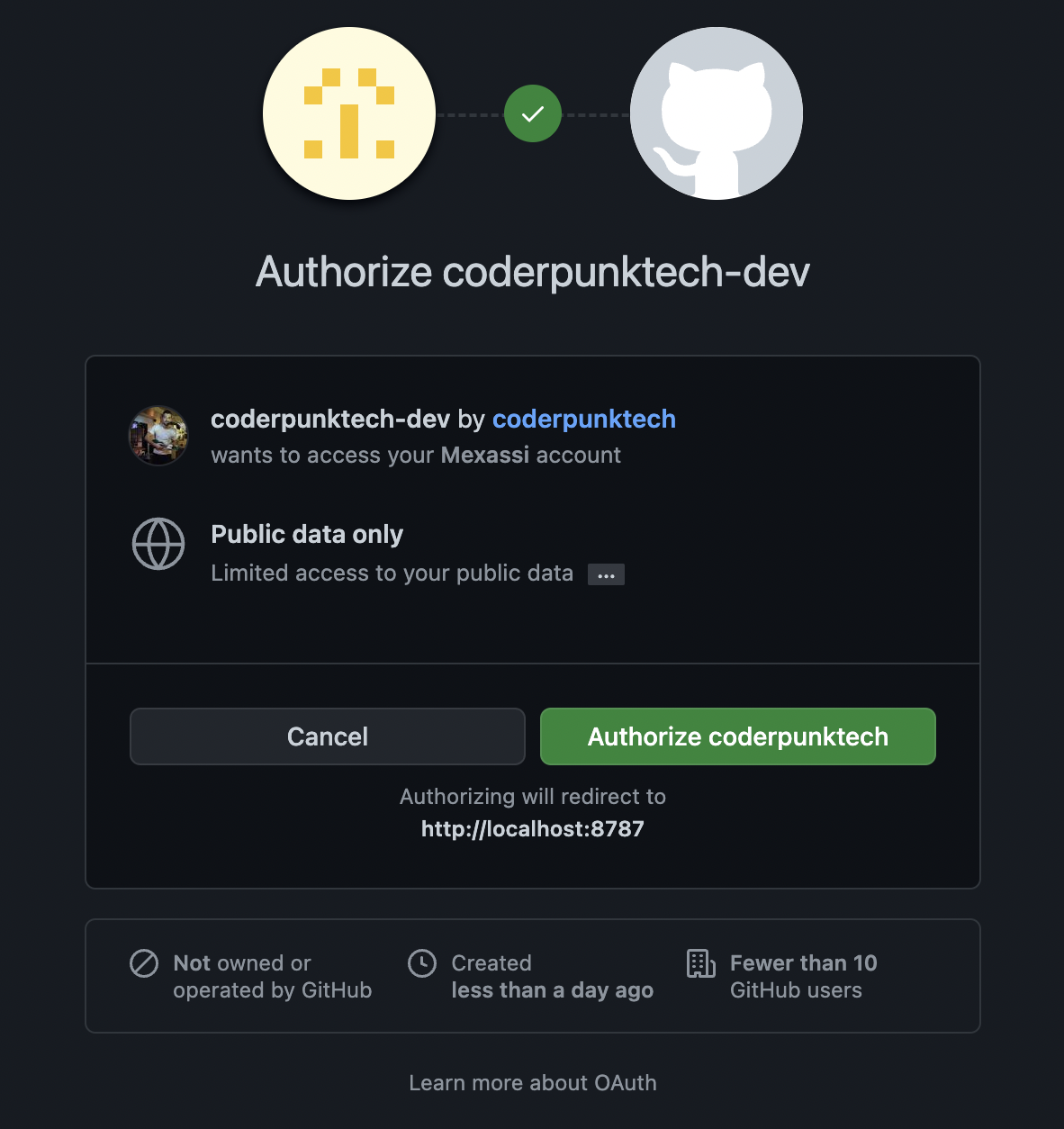 After clicking the login button I am prompted to authorize the Github app I have previously created.
